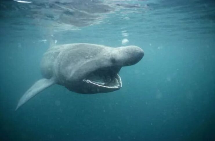Looking scary at all with that large mouth, a basking shark is actually very docile and harmless. It is true that their mouths are big enough to swallow us whole, but they have no interest in eating humans. At the same time, basking sharks lack sharp teeth and they are not aggressive or dangerous at all. Out of curiosity, basking sharks sometimes calmly circle groups of divers and snorkelers in the water. As filter feeders, the size of their mouths helps them to catch plankton easily.