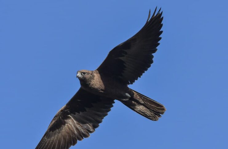 Falcons are incredible hunters, and so is this one. It simply swoops down and grasps the meal in its claws, and kills the prey with a bite to the spine. Even if they can hunt, black falcons also steal prey from other raptors sometimes. Black falcons feed on pretty much anything from birds and insects to reptiles and small mammals, even carrion. These raptors live along tree-lined watercourses, arid areas, isolated woodlands, and semiarid areas.