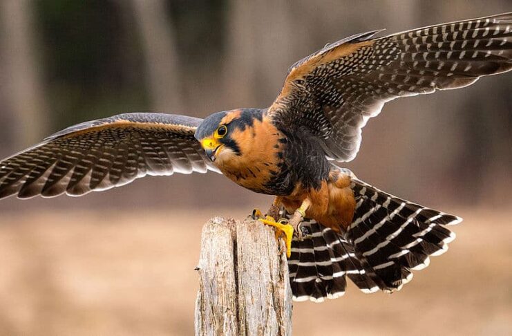 Here you are looking at not only one of the largest falcons but also a colorful and stunning species. The first thing that attracts people’s attention is definitely the black and white stripes on their faces. Plus with the yellow cere, eye-ring, and feet, the Aplomado falcons look absolutely gorgeous. These falcons are the dwellers of coastal grasslands, deserts, and marshes in the southwestern United States to Central and South America. The open habitats that they prefer are full of insects and songbirds such as bats, butterflies, dragonflies, and even rodents.
