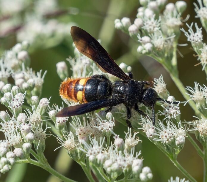 The ranges of the blue-winged wasps are in the United States, from New England all the way to Florida. They prefer temperate habitats where they can burrow into soil to find grubs. So, it is very common to find them in fields, lawns, or meadows where grubs are abundant and easy to find. Adults only feed on flower nectar, so the habitat preference is beneficial for both the parents and the larvae. While sounding very ferocious, blue-winged wasps are very helpful in controlling grub infestation. On top of that, they are also great pollinators of garden plants and native flora as well. They are able to sting, but only to defend themselves. Solitary wasps are usually docile, and these wasps fall prey to birds and other predatory insects.