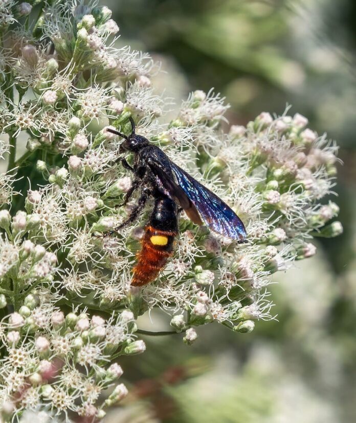 Being pretty small, a blue-winged wasp is only around 2 to 2.5 centimeters long, and its coloration is everything. It has a black body, but the second and third abdominal segments of its body are reddish-brown. This fuzzy reddish-brown or rusty patch covers the rest of the wasp’s abdomen. On each of the abdomen, there is a yellow spot, and the whole body is usually hairy. As for the wings, they are deep and iridescent blue-black in color, with blueish reflections, while the head is also blueish-black. Adult blue-winged wasps have black antennae, and males have longer antennae than females.