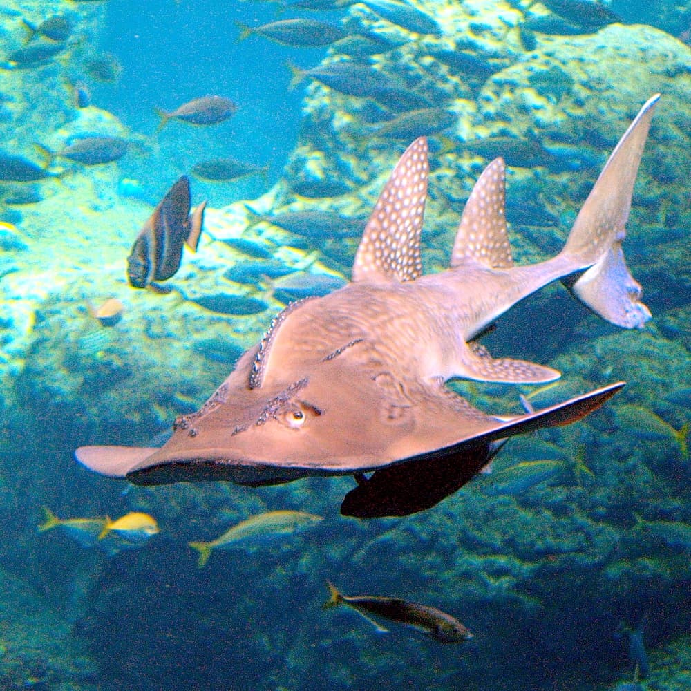 When it comes to appearance, it is very obvious that the bowmouth guitarfish looks out of this world. A bowmouth guitarfish is a large species that can reach a length of up to 2.7 meters. The fish is bluish to brownish gray above, with a light gray to white underside to camouflage. There are prominent white spots all over its body and fins. It has a short head that is flattened and wide, and a rounded snout. On its head and back, there are bands of thorny ridges that give it a very strange look. Its mouth forms a longbow shape with an undulating line; hence the name. As for the tail, it is much longer than the body, and it ends in a large and crescent-shaped caudal fin. Bowmouth guitarfish are gentle giants; they are not aggressive, and they often flee from divers.
