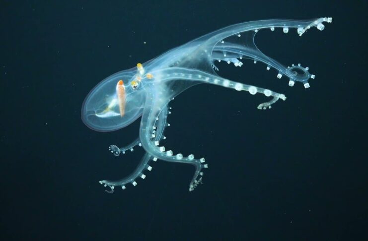With a soft and gelatinous body that we can see through, glass octopus is also among the cool-looking transparent animals. This stunning creature lives worldwide in tropical and subtropical seas, and they have four pairs of arms. One more thing, the octopus has strange rectangular eyes on stalks that you can see through its transparent body. That is not all, even their digestive gland is also visible as well. Plus with their bluish blood, this glass octopus is definitely one of a kind when it comes to the beauty of nature.