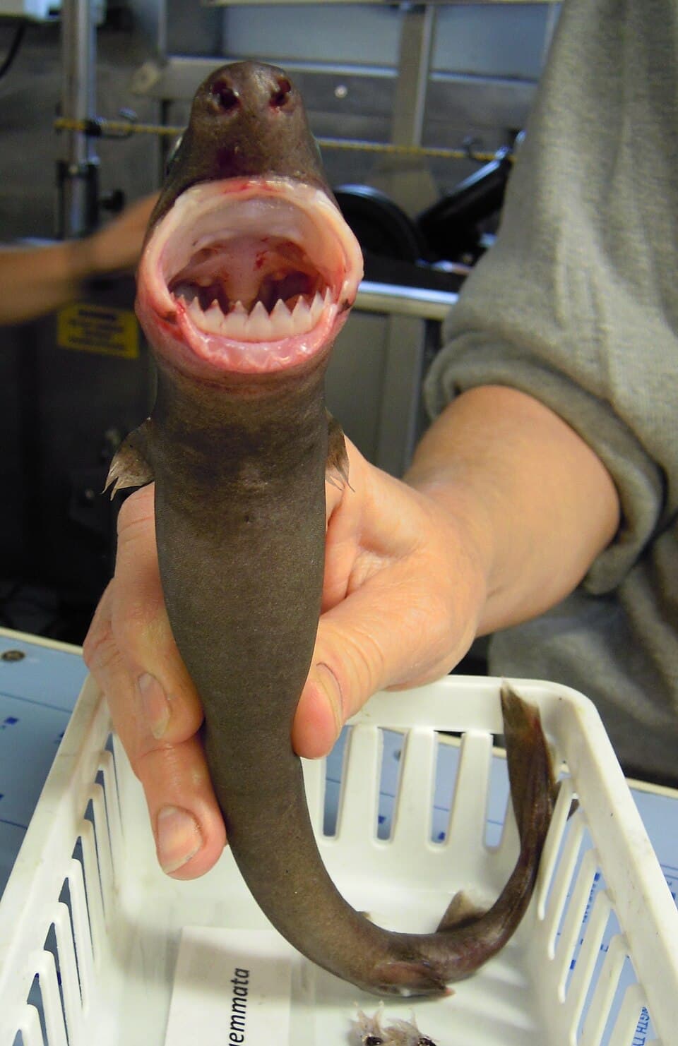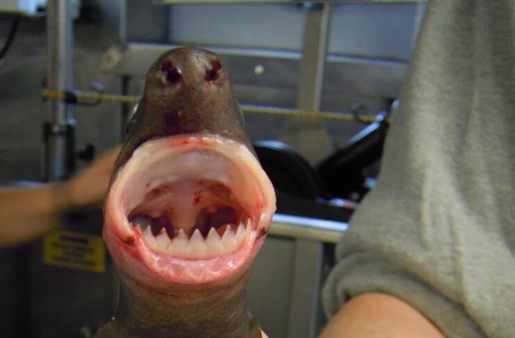 What makes it different from other sharks is its upper and lower teeth. The upper teeth of a cookiecutter shark are small, narrow, and upright. Meanwhile, the lower teeth are smooth-edged, broader, and larger, as well as knife-like. With the bases interlocking, it forms a single saw-like cutting edge; with 435 to 465 teeth in total. It got its name from its unique feeding method of gouging round plugs that resemble cuts by a cookie cutter. This shark has a very wide gape and strong teeth, making it quite dangerous to be around.
