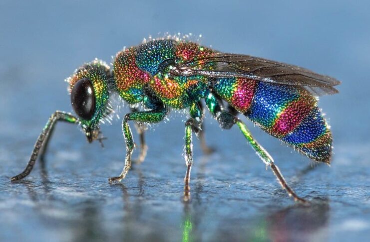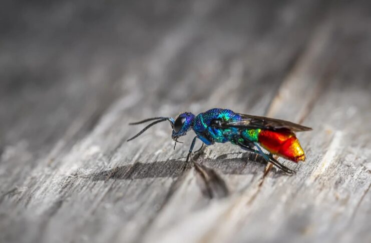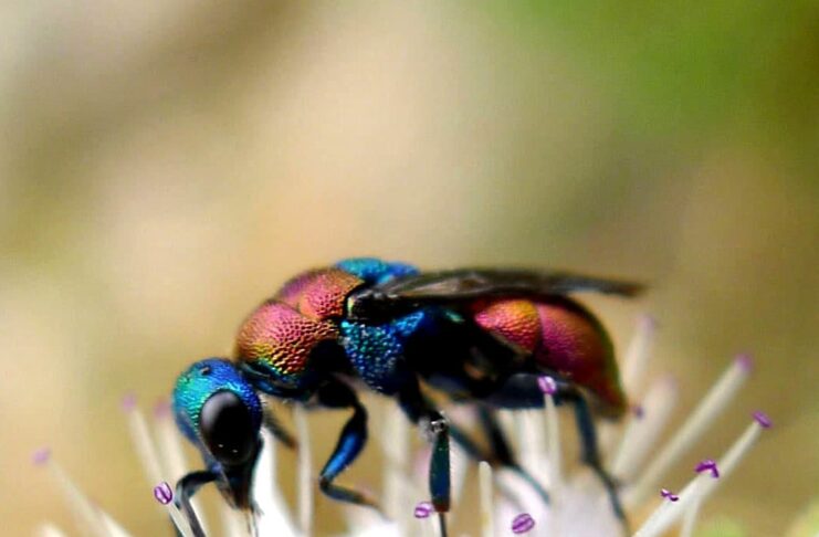 While being so strikingly stunning, these wasps are quite deadly for other solitary bees and wasps. This wasp species takes the poor insects’ nests and then lay eggs within the owners of the nests. That is not all, these wasps also consume the food that the hosts gather as well. Is this wasp that strong? Not always because they also come across strong angry adults in the nests sometimes. The thing is their strong exoskeleton allows them to protect themselves and stay safe.