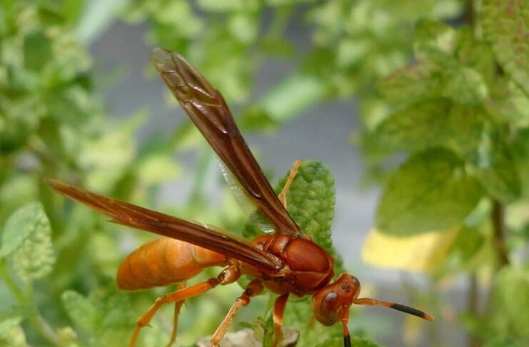 A Neotropical red paper wasp has a light to dark mahogany-brown body, with a light shade in the head and thorax sometimes. At the same time, it also has purplish-black wings with yellow markings which are quite easy to recognize. In general, red paper wasps are large which is quite scary for some because of their size and bright color. The thing is that they are neither dangerous nor aggressive towards humans because their venom can only inflict little pain for a short while.