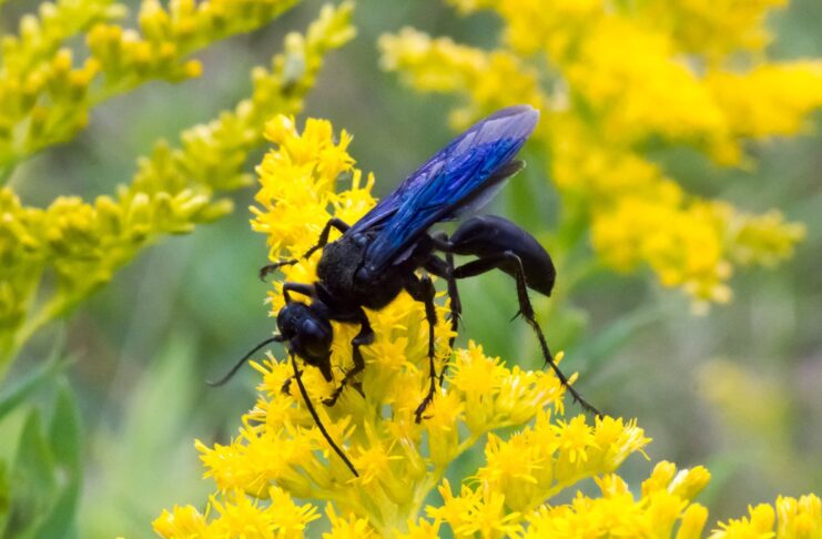 Adult males and females feed on nectar from flowers and honeydew secreted by insects. While females are solitary, males are sometimes found in a large congregation sleeping after “drinking” too much. Simply put, it is okay to come across many blue mud daubers as they are normally harmless to humans.