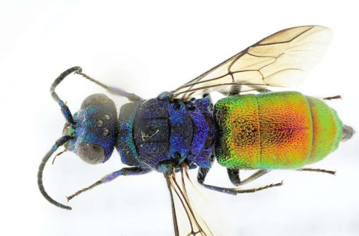 Looking absolutely stunning, these wasps have a metallic blue-green body with red second and third leg pairs. The exoskeleton of these wasps is very colorful and shiny, looking extremely attractive. Their natural habitats are where the temperatures are high year-round which is in Africa, South, Southeast Asia, and the Pacific Islands.