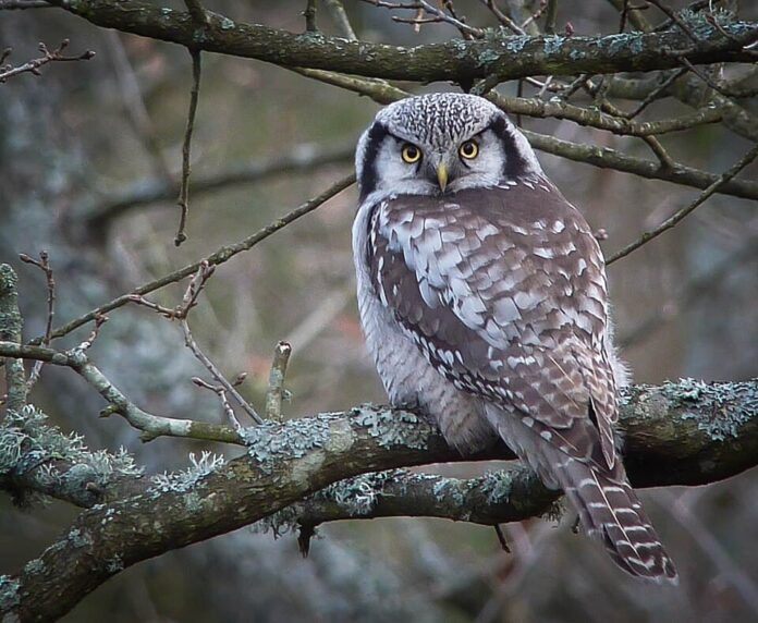 Here you are looking at one of the very few diurnal owl species that are more active during the day. A northern hawk owl has dark brown plumage with an off-white spotting pattern on its body’s dorsal parts. It has a round head with a white face and a yellow beak, and a long tail with brown banding. Males are usually 35 to 42.5 centimeters long, while females are 37.2 to 44.7 centimeters long. Northern hawk owls have yellow eyes, indicating their diurnal behavior. They got their name from the hawk-like appearance and habits. More than that, it has a rapid and direct manner of flight, which is similar to that of Cooper’s hawk. It is also about the same size, and it is easy to confuse the two when they perch.