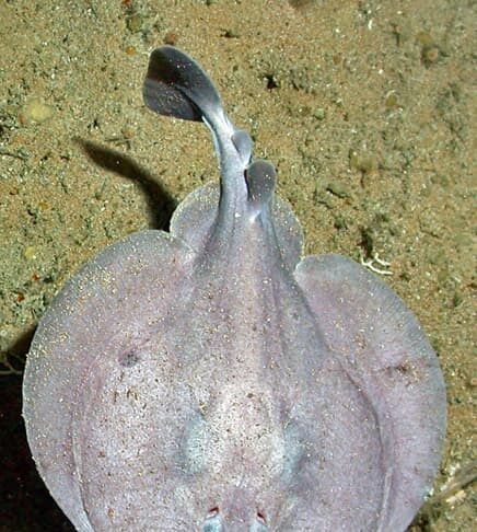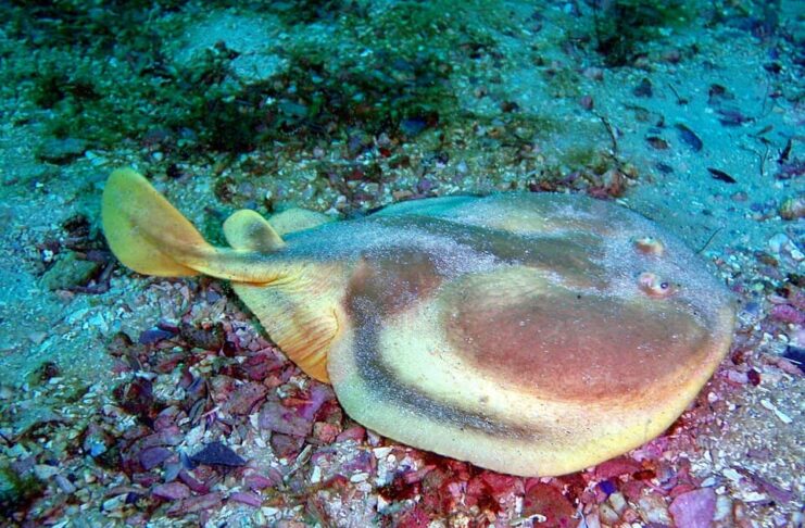 Rather a brighter one amongst other electric rays on the list, this one is dark brown in color with yellowish spots. A marbled electric ray can reach the length of up to 1 meter long, and females are larger than males. What’s super cool about these electric rays is the way they protect themselves against predators. A marbled electric ray will swim in a loop or curl up with its underside facing outward. This allows it to emit electric shocks and electrocute predators upon contact with from 80 up to 200 volts of electricity.