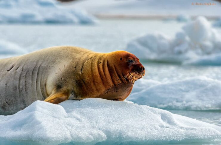 Bearded seals are the largest seals in the Arctic, and the females are larger than the males. The unique thing about them is that they have tougher skin than most other seals. That makes them a highly valuable resource for the Inuit who used their skin for daily used items. That includes shoes, dog harnesses, whips, boat covers, tent covers, and so on. Primarily benthic, bearded seals prefer shallow waters and they don’t dive very deep. These seals feed on a variety of small prey that can find along the floor. Their main food includes clams, squid, fish, and more.