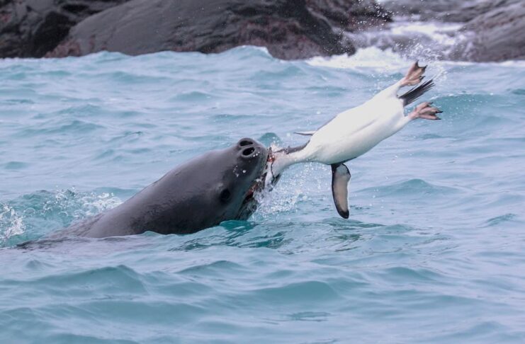 Being the most aggressive seals in the family, leopard seals are extremely powerful seals and great hunters. They are the second largest seals, and they are the fastest seals among their species. These seals have very sharp teeth, and that allows them to consume smaller seal species and penguins. They often wait underwater near an ice shelf and snare the birds just as they enter the water after jumping off the ice. These ferocious predators may also come up beneath seabirds resting on the water surface and snatch them in their jaws.