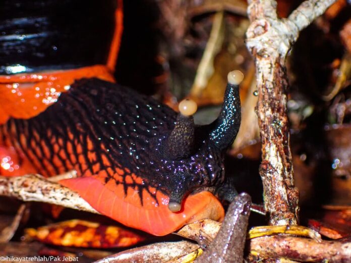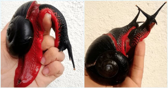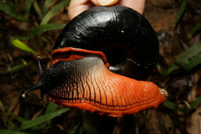 Not too hard to recognize, a fire snail has a black shell and body, while the foot is bright red to orange. The fiery color makes it look absolutely stunning, and it is exactly how the fire snail earns its name. Just like most snails, its bulbous eyes are located on the tentacles. Besides the appearance, it is also the largest land snail in Peninsular Malaysia, with a shell size of around 8 centimeters. As for the snail’s flamboyant body, it can reach an impressive length of 20 centimeters.