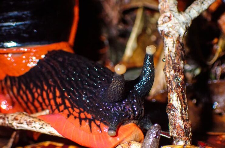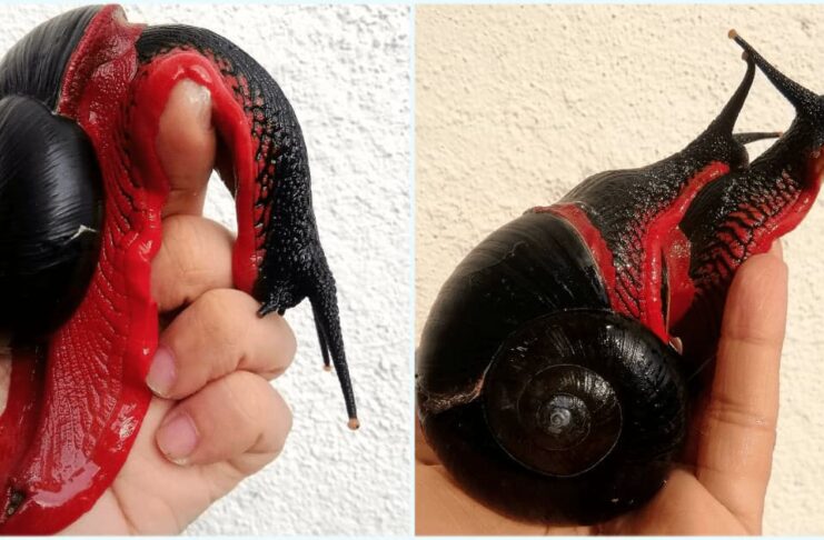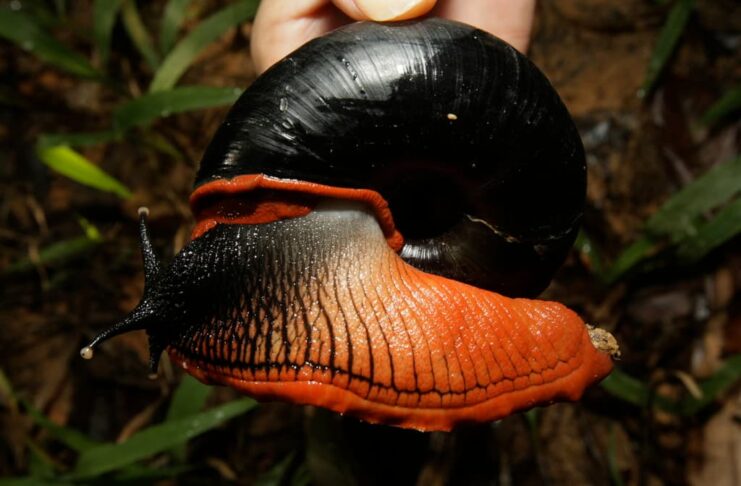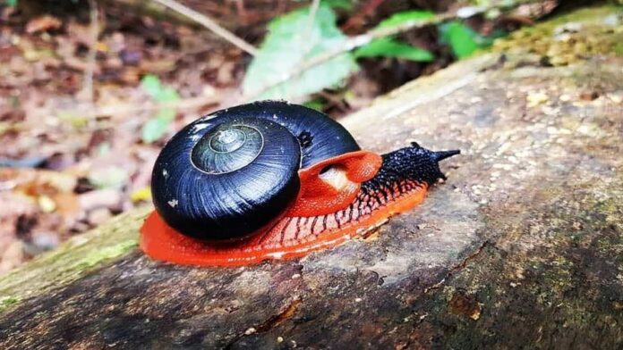 Not too hard to recognize, a fire snail has a black shell and body, while the foot is bright red to orange. The fiery color makes it look absolutely stunning, and it is exactly how the fire snail earns its name. Just like most snails, its bulbous eyes are located on the tentacles. Besides the appearance, it is also the largest land snail in Peninsular Malaysia, with a shell size of around 8 centimeters. As for the snail’s flamboyant body, it can reach an impressive length of 20 centimeters.