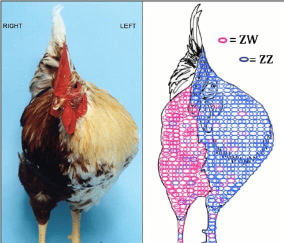 Another case of gynandromorph birds is chicken, but gynandromorph chicken is not as common as butterflies. The interesting thing about gynandromorph chicken is that half of them is a hen while another half is a cockerel. The cockerel part has a larger wattle, bigger breasts, and leg spur with different colors. In the case of gynandromorph chicken, it has a testicle on one side and an ovary on another side. There is another case where it had a strange hybrid organ that was part testicle and part ovary.