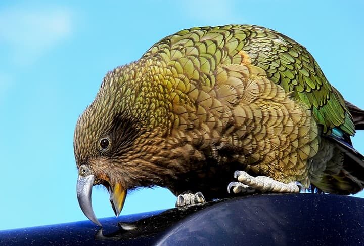 Besides the unique appearance, kea parrots are also known for their curiosity and intelligence; just like most parrots. These birds can solve logical puzzles like pulling and pushing things in a certain order to get to the food. At the same time, they also can work together as a team to achieve a common goal set for them. Their curiosity and fearlessness of humans somehow cause trouble to people, especially hikers skiers, or tourists. They will investigate backpacks, boots, and even cars, often causing damage or flying off with smaller items. One kea parrot once made off with a tourist’s passport while others like to snatch wallets and other things.