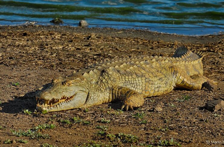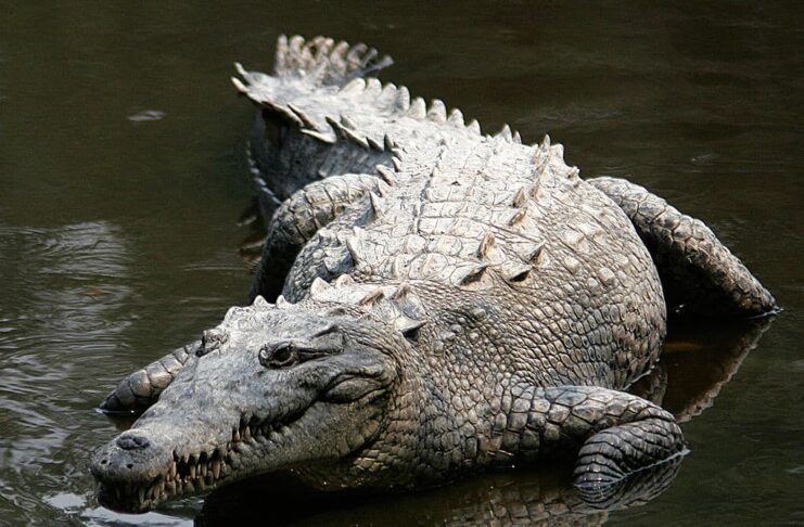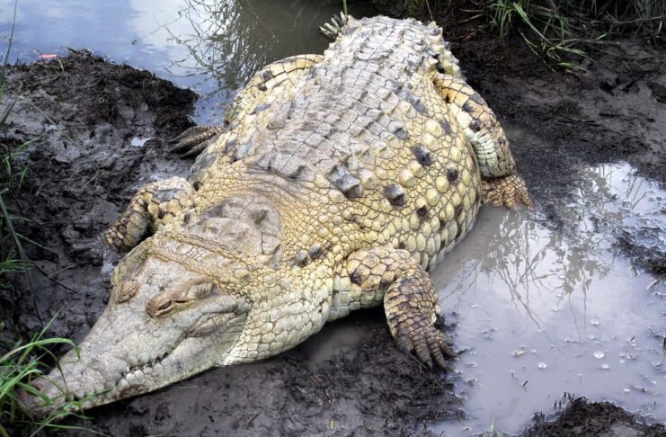 What we have here is the largest freshwater crocodiles in Africa, reaching the length of 5 meters. Actually, it is the second-largest extant reptile in the world, after the saltwater crocodile. It has a dark bronze body with faded blackish spots and stripes across the back. As for its flank, it is yellowish-green in color, with dark patches arranged in stripes and patterns. That body is adorned with a scale hide with rows of scutes running down its back and tail. Its legs are short and splayed, and it has a long and powerful tail. This large freshwater crocodile species has a powerful bite, and it has sharp conical teeth that deliver a strong grip. Once those teeth sink into a prey’s flesh, there is no letting go.