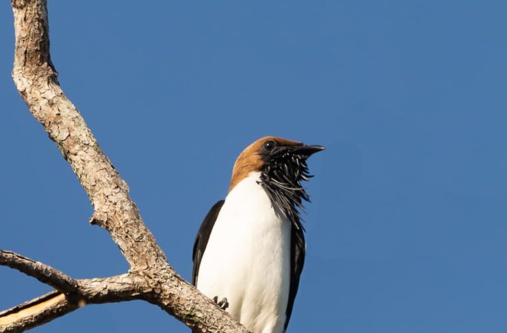 The name says it all, a bearded bellbird looks like it has a beard under its beak. A male bearded bellbird has a white plumage, brown head, and black wings, and he is around 28 centimeters. The distinctive feature in a male is the several black unfeathered wattles that hang from his throat. Those black stringy wattles resemble a beard; hence the name. Just like other bellbird species out there, this one also makes very loud calls to attract mates and declare territories. As for the females, they are smaller, and they have olive-green upperparts and yellow underparts. This bellbird species occurs in northern South America, inhabiting moist tropical forests where it feeds mainly on berries and fruits. The population of this bird is good overall, but they are considered Vulnerable in Brazil. Some of the main threats are deforestation and trapping, which lead to the decline of their number.