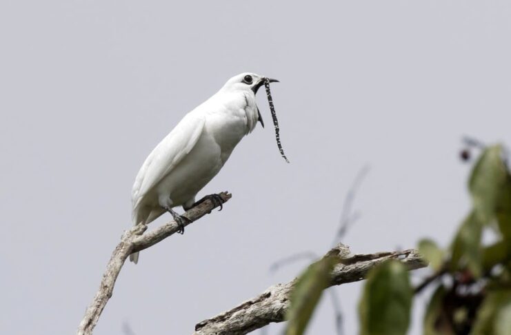 Bare-throated bellbird is a beautiful bellbird species, but only the males are gifted with the gorgeous look. Male bare-throated bellbirds have white plumage and bristly bluish-black skin around their eyes, beak, and throat. Females are rather plain, with olive-brown above and streaked yellow underparts. The females are around 27 centimeters long, while the males are slightly larger, measuring around 29 centimeters. They both have very wide gape,s which they use for feeding. Males make loud calls to attract a mate, usually from a high branch, and the breeding season is from September to February.