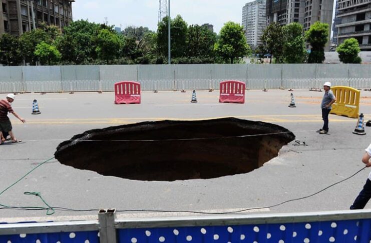 Sinkholes actually occur all over the world, but more of them have been popping up in China lately. In another separate incident, a sinkhole appeared in the middle of a highway in Changsha and swallowed a BMW with 3 passengers. The incident killed one passenger, and the pit was at least 30 meters wide and too deep to see the bottom.