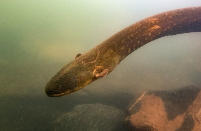 This is the best-known electric eel species among the rest, but it is actually not an eel. It is a knifefish, just a freshwater fish that has electrogenic tissue that can produce electric discharges. An electric eel has an elongated and cylindrical body that measures up to 2 meters or even longer. It is dark gray-brown on the back and yellow or orange on the belly, and mature females have a darker abdomen. Just like other electric eels in the family, this one also has thick and scaleless skin that is slimy.