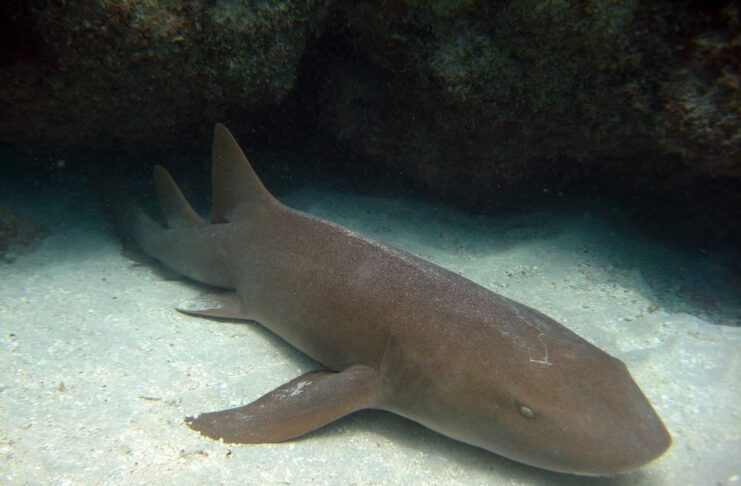 A nurse shark can reach a maximum length of 3 meters long but larger individuals do exist. It has a broad head with a pair of long barbel, and a brownish body that is smooth to the touch. The shark has a pair of two conspicuous barbels between the nostrils that it uses to find food. More than that, it has distinctive tail fins that take up to one-fourth of its total length. One of the most interesting things about this carpet shark species is that they are docile and robust. They can tolerate capture, handling, and tagging extremely well which is very important for shark research. This carpet shark species is classified as Vulnerable on the IUCN Red List.