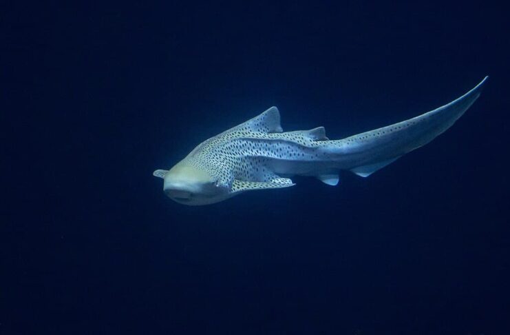 A zebra shark has a cylindrical body with a large and slightly flattened head, and a short blunt snout. It has small eyes on the sides of its head, and there are spiracles behind those eyes. Adult zebra sharks can reach a length of 2.5 meters, with a distinctive appearance of 5 ridges on its body. Along with that, there is also a pattern of dark spots on the pale background of its body as well. As for the young ones, they are around 50 to 90 centimeters long, with light vertical stripes on a brown background instead. Juvenile zebra sharks don’t have ridges like the adult ones at all. These sharks use their whisker-like barbels to detect prey in the dark, and they have strong teeth that can crunch through tough shells.